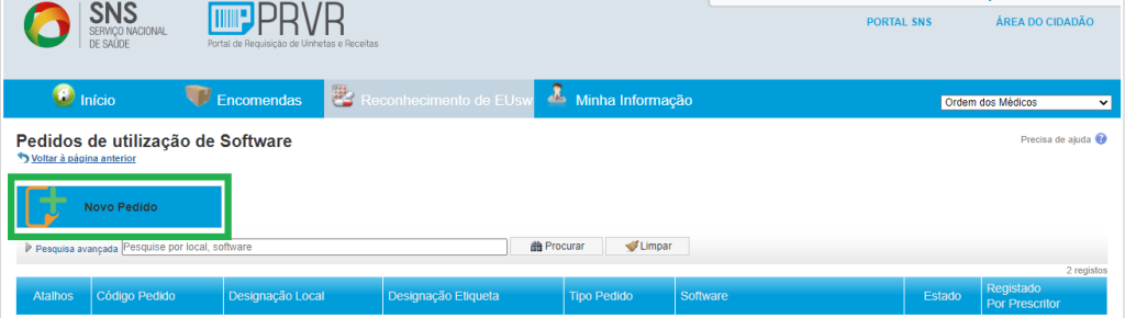 Um dos requisitos para que possa completar o Registo na Scribo é o pedido de utilização do software de prescrição no Portal de Requisição de Vinhetas e Receitas (PRVR). Ao entrar no PRVR segui os seguintes passos:
