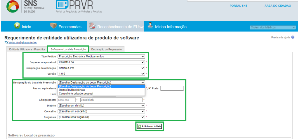 Na página de “Requerimento de entidade utilizadora de produto de software” clique em Software e Local de Prescrição e preencha os campos de acordo com a figura (Prescrição Eletrónica Medicamentos / Kenetto Lda. / Scribo e-PM / 1.0.0) e abaixo escolha a designação do local de prescrição (Domicílio/ Residência ou Consultório Privado Pessoal) e preencha o endereço completo e clique em “Adicionar à Lista”